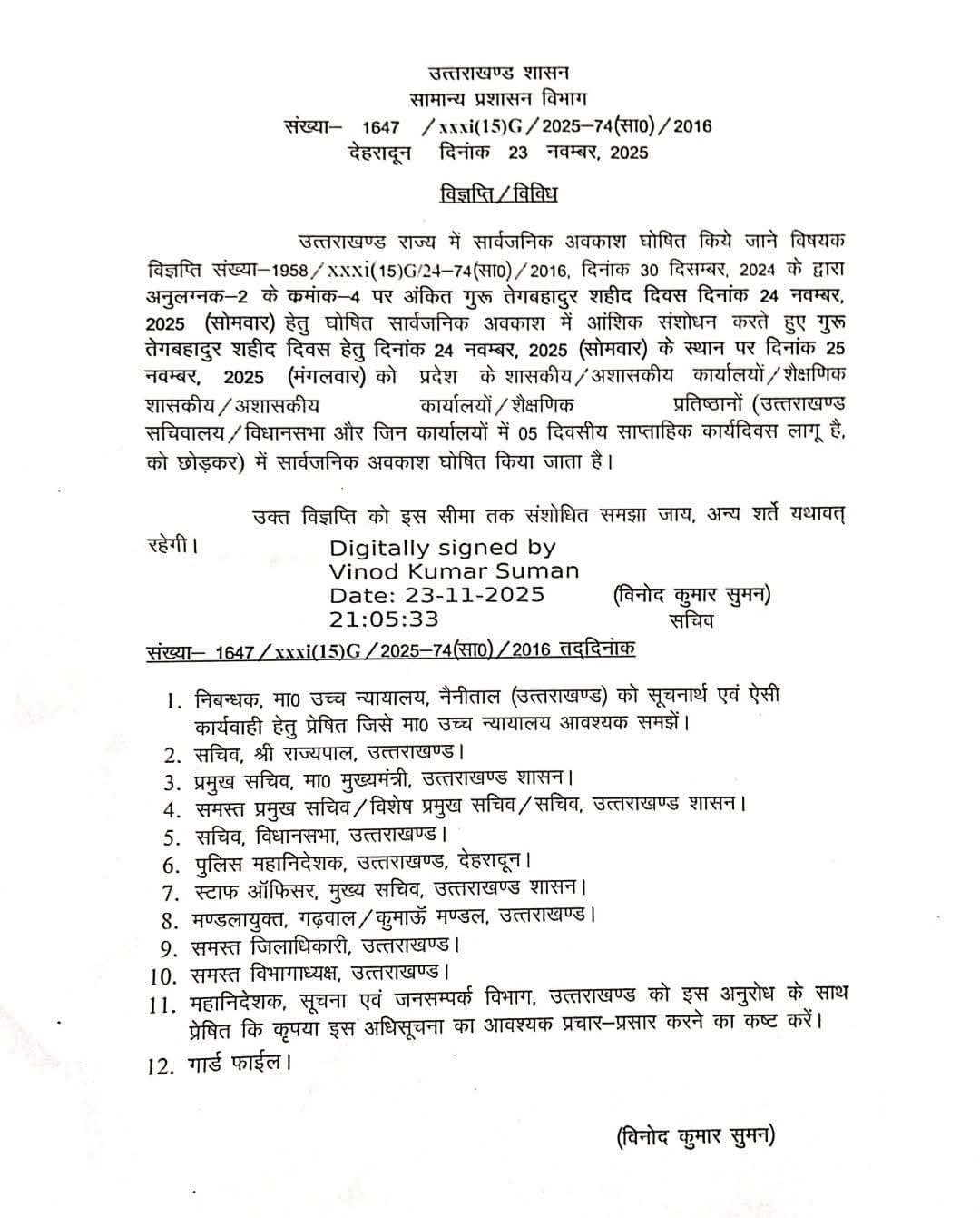 उत्तराखण्ड राज्य में सार्वजनिक अवकाश घोषित किये जाने विषयक विज्ञप्ति संख्या-1958/xxxi (15) G/24-74 (सा0)/2016, दिनांक 30 दिसम्बर, 2024 के द्वारा अनुलग्नक-2 के कमांक-4 पर अंकित गुरू तेगबहादुर शहीद दिवस दिनांक 24 नवम्बर, 2025 (सोमवार) हेतु घोषित सार्वजनिक अवकाश में आंशिक संशोधन करते हुए गुरू तेगबहादुर शहीद दिवस हेतु दिनांक 24 नवम्बर, 2025 (सोमवार) के स्थान पर दिनांक 25 नवम्बर, 2025 (मंगलवार) को प्रदेश के शासकीय/अशासकीय कार्यालयों/शैक्षणिक शासकीय / अशासकीय कार्यालयों / शैक्षणिक प्रतिष्ठानों (उत्तराखण्ड सचिवालय / विधानसभा और जिन कार्यालयों में 05 दिवसीय साप्ताहिक कार्यदिवस लागू है. को छोड़कर) में सार्वजनिक अवकाश घोषित किया जाता है।