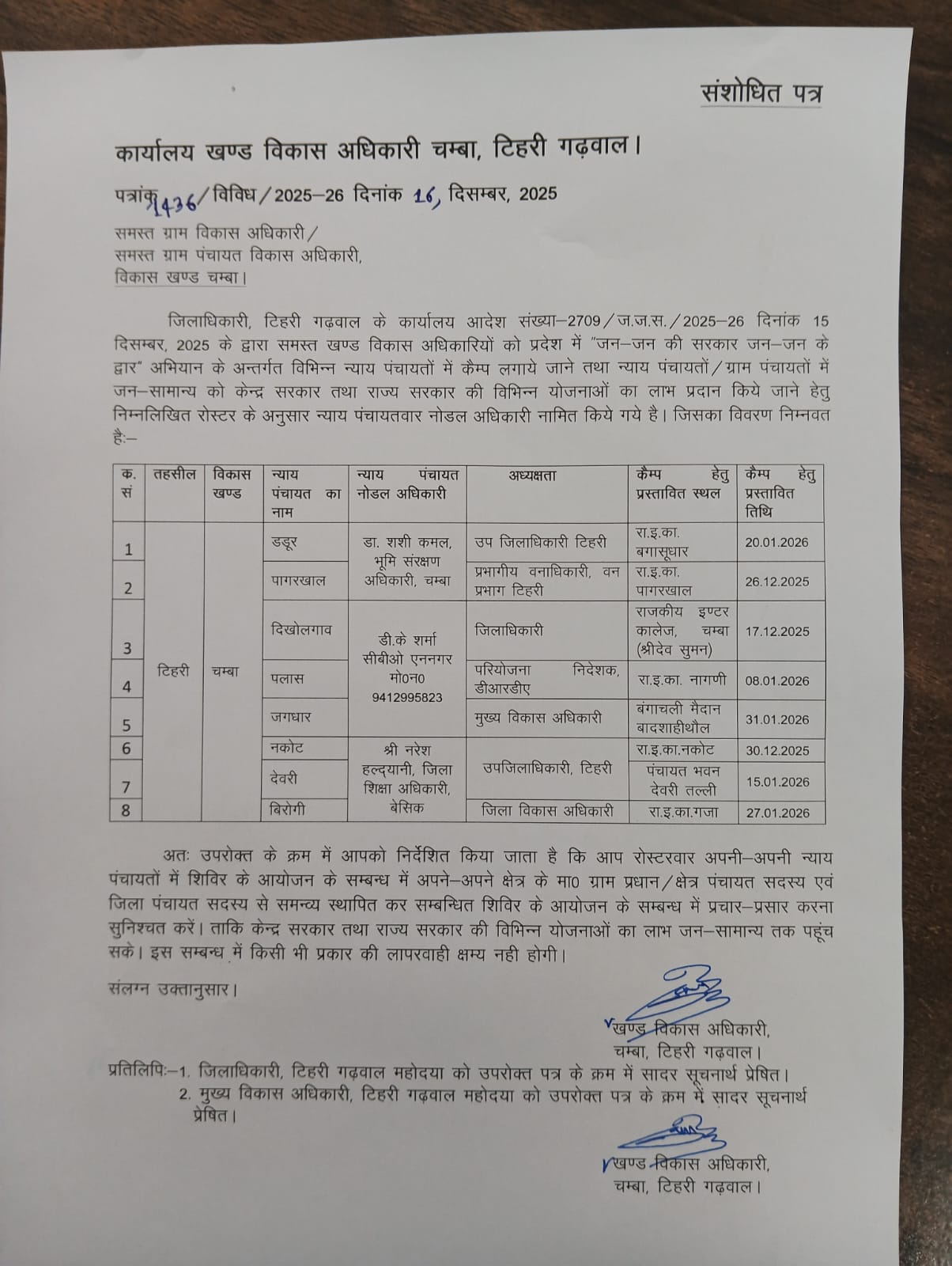 जिलाधिकारी टिहरी के निर्देशानुसार खंड विकास अधिकारी चम्बा ने अपने पत्रांक 436 /विविध / 2025-2026 दिनांक 16 दिसम्बर मे सभी ग्राम विकास अधिकारी / ग्राम पंचायत विकास अधिकारियों को कार्यक्रम का रोस्टर जारी किया है।