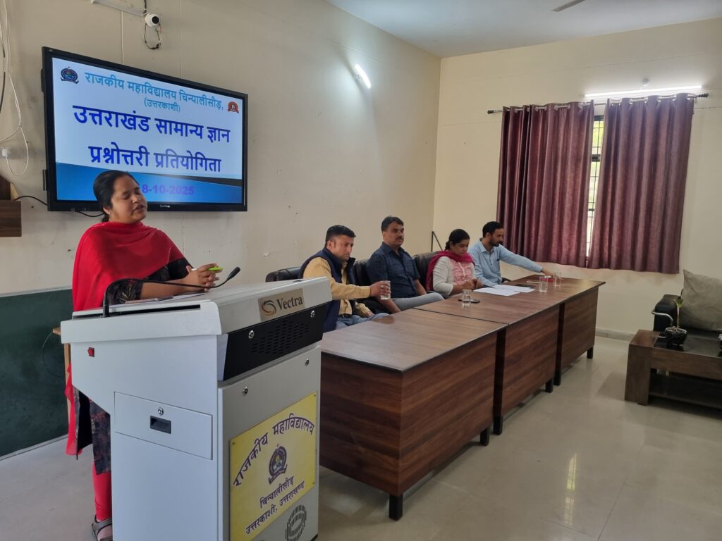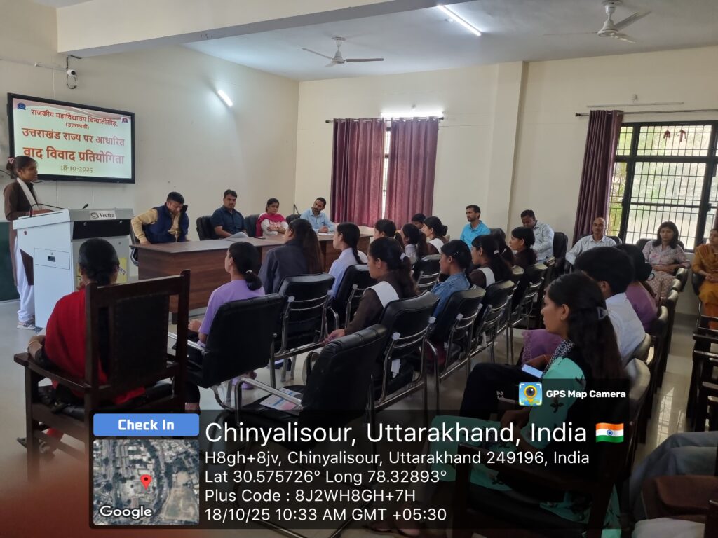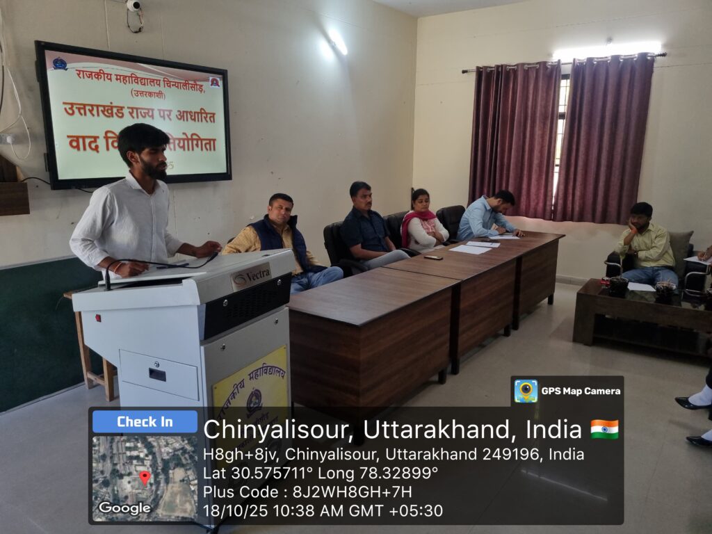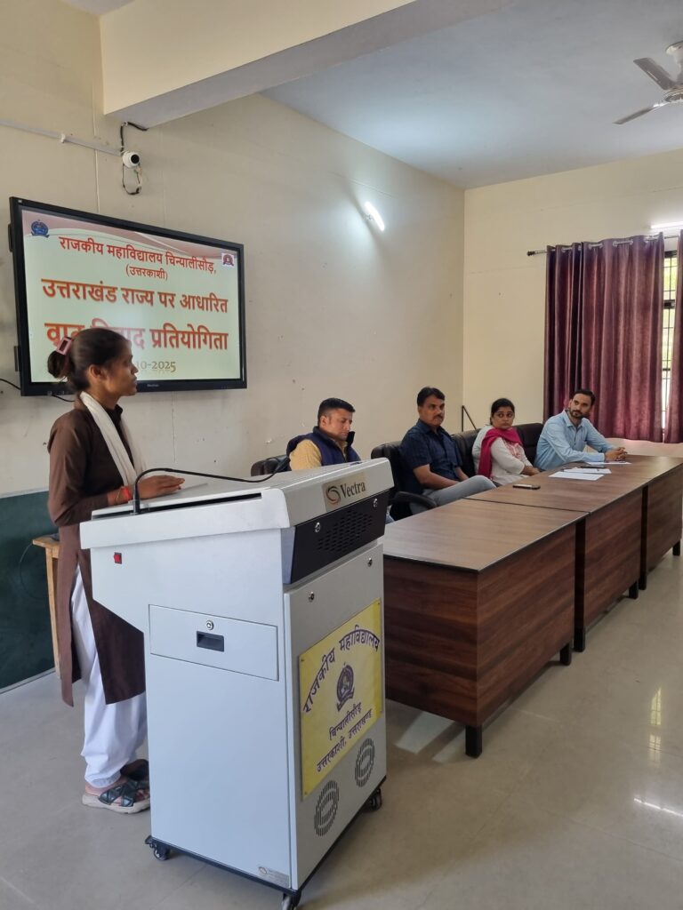 दिनांक 18 अक्टूबर 2025 को राजकीय महाविद्यालय चिन्यालीसौड़ में उत्तराखंड राज्य के 25वें स्थापना दिवस के महत्वपूर्ण अवसर के उपलक्ष्य में वाद-विवाद एवं प्रश्नोत्तरी प्रतियोगिताओं का आयोजन किया गया। दोनों प्रतियोगिताएं महाविद्यालय के प्राचार्य प्रोफेसर प्रभात द्विवेदी जी की अध्यक्षता तथा वाणिज्य विभाग की प्राध्यापिका डॉ सुगंधा वर्मा के संयोजन एवं संचालन में संपन्न हुईं।
