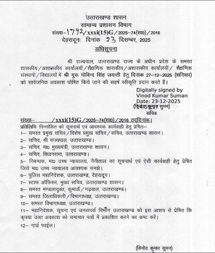 आदेश में कहा गया है “श्री राज्यपाल, उत्तराखण्ड राज्य के अधीन प्रदेश के समस्त शासकीय/अशासकीय कार्यालयों / शैक्षणिक शासकीय/अशासकीय कार्यालयों / शैक्षणिक संस्थानो / विद्यालयों में श्री गुरू गोविन्द सिंह जयन्ती हेतु दिनांक 27-12-2025 (शनिवार) को सार्वजनिक अवकाश घोषित किये जाने की सहर्ष स्वीकृति प्रदान करते हैं।