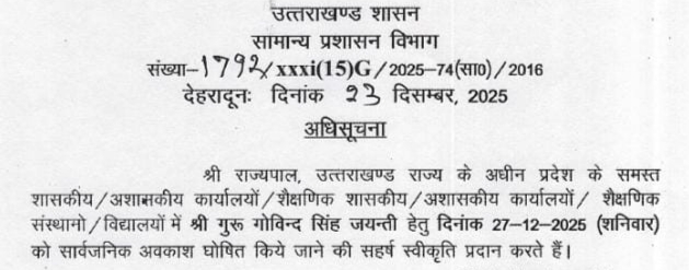 आदेश में कहा गया है “श्री राज्यपाल, उत्तराखण्ड राज्य के अधीन प्रदेश के समस्त शासकीय/अशासकीय कार्यालयों / शैक्षणिक शासकीय/अशासकीय कार्यालयों / शैक्षणिक संस्थानो / विद्यालयों में श्री गुरू गोविन्द सिंह जयन्ती हेतु दिनांक 27-12-2025 (शनिवार) को सार्वजनिक अवकाश घोषित किये जाने की सहर्ष स्वीकृति प्रदान करते हैं।