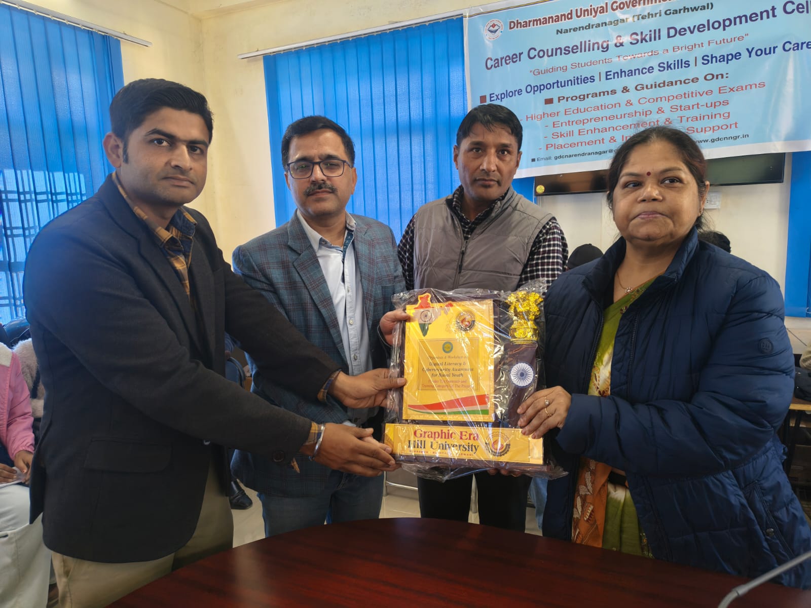 नरेंद्रनगर। धर्मानंद उनियाल राजकीय महाविद्यालय, नरेंद्रनगर के करियर काउंसलिंग एवं स्किल डेवलपमेंट सेल एवं एन॰एस॰ एस के अंतर्गत, ग्राफिक एरा हिल विश्वविद्यालय, देहरादून के सहयोग से “डिजिटल साक्षरता और साइबर सुरक्षा जागरूकता” विषय पर एक दिवसीय कार्यशाला आयोजित की गई।