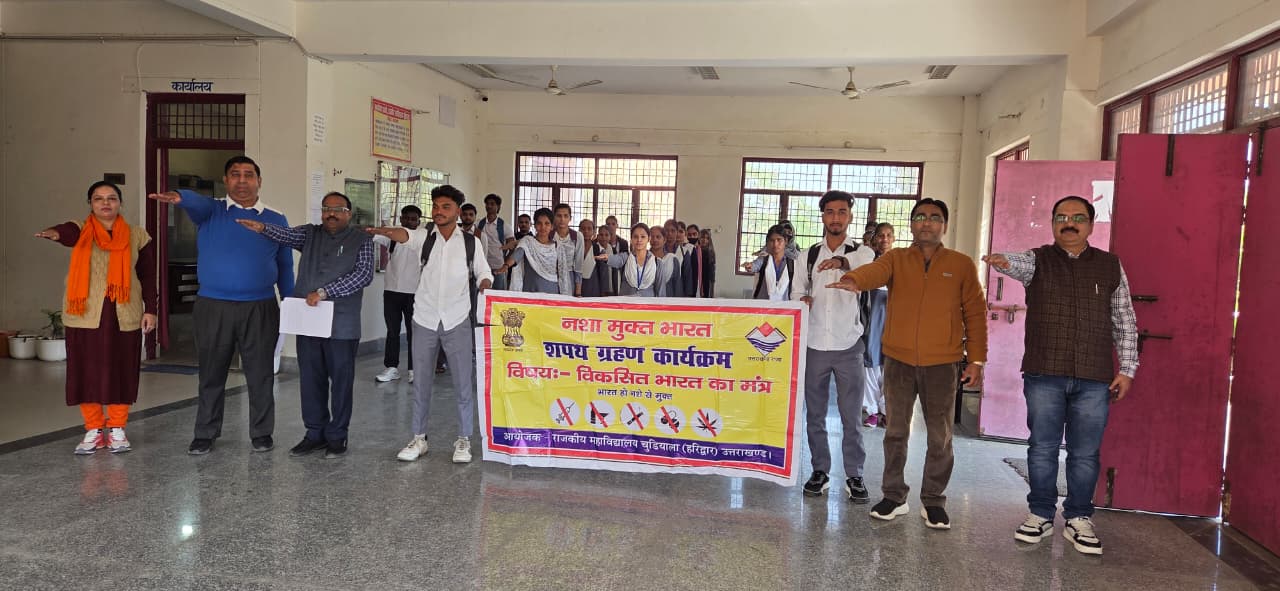 आज दिनांक 18 नवंबर 2025 को राजकीय महाविद्यालय चुड़ियाला भगवानपुर हरिद्वार में प्राचार्य राजकीय महाविद्यालय डॉक्टर सीपी सिंह द्वारा महाविद्यालय के प्राध्यापक गण कर्मचारी गण एवं समस्त उपस्थित छात्र-छात्राओं को नशा मुक्ति अभियान के अंतर्गत नशा मुक्त रहने हेतु शपथ दिलाई गई।