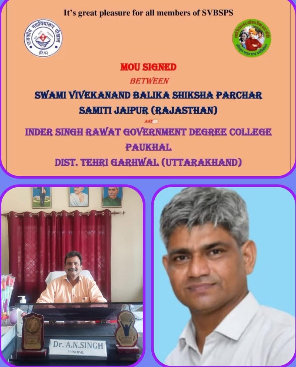 ज्ञान के आदान-प्रदान और अनुसंधान को बढ़ावा देने के उद्देश्य से, हाल ही में दो प्रतिष्ठित संस्थानों – इंदर सिंह रावत राजकीय महाविद्यालय पौखाल टिहरी गढ़वाल उत्तराखण्ड एवं स्वामी विवेकानंद बालिका शिक्षा प्रचार समिति जयपुर राजस्थान के बीच एक महत्वपूर्ण समझौता ज्ञापन (MOU) पर हस्ताक्षर किए गए।