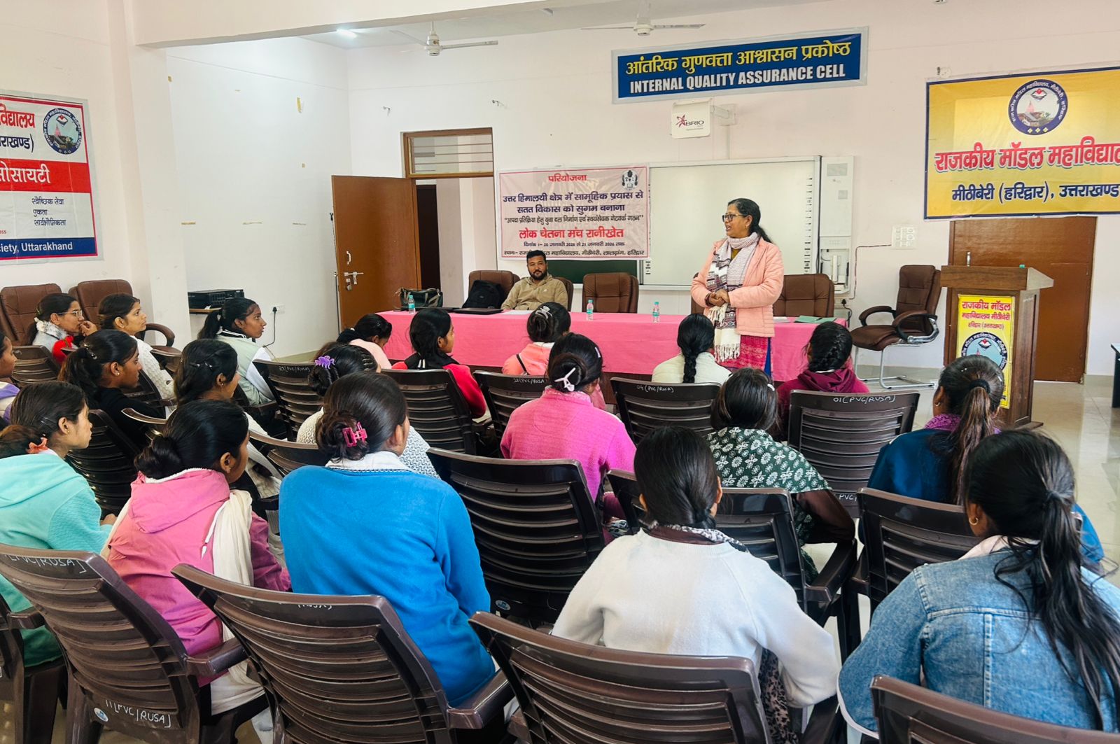 तत्पश्चात कार्यक्रम के प्रथम सत्र में मुख्य अतिथि श्रीमती मीरा रावत ने छात्र छात्राओं को आपदा प्रबंधन के बारे में जानकारी प्रदान करते हुए विभिन्न प्रकार के अधिनियमों से अवगत कराया।