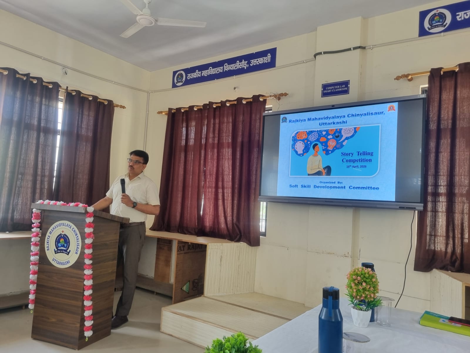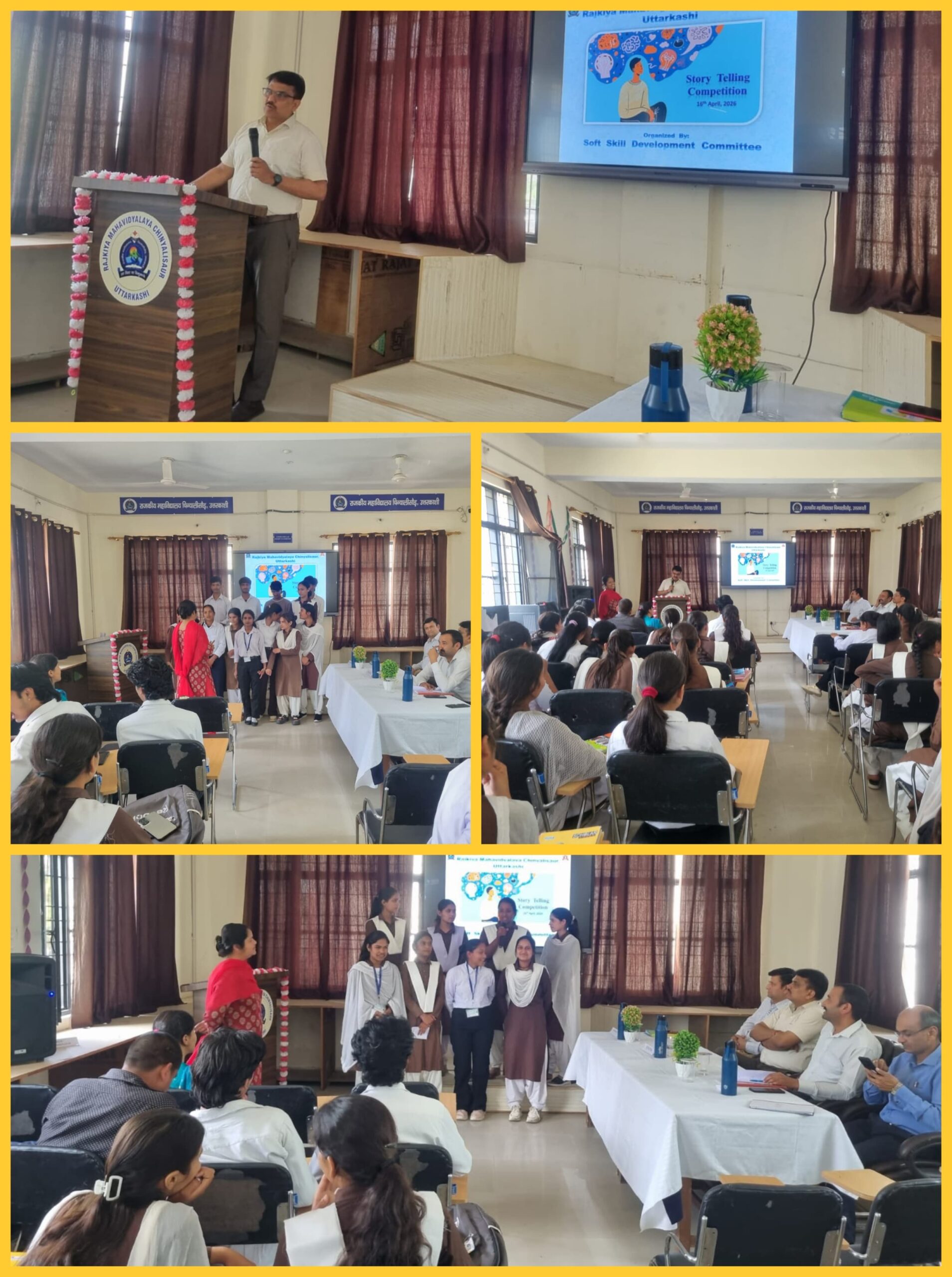 आज दिनांक 16 अप्रैल 2026 को राजकीय महाविद्यालय चिन्यालीसौड़ में सॉफ्ट स्किल डेवलपमेंट समिति के तत्वावधान में स्टोरी टेलिंग प्रतियोगिता का आयोजन किया गया। इस प्रतियोगिता में विद्यार्थियों ने टीम वर्क, आपसी सहयोग, रचनात्मकता एवं कल्पनाशीलता का शानदार प्रदर्शन किया। प्रतिभागियों को ऑन द स्पॉट विषय प्रदान किए गए, जिन पर उन्होंने तत्क्षण कहानी का निर्माण कर प्रस्तुतिकरण किया।