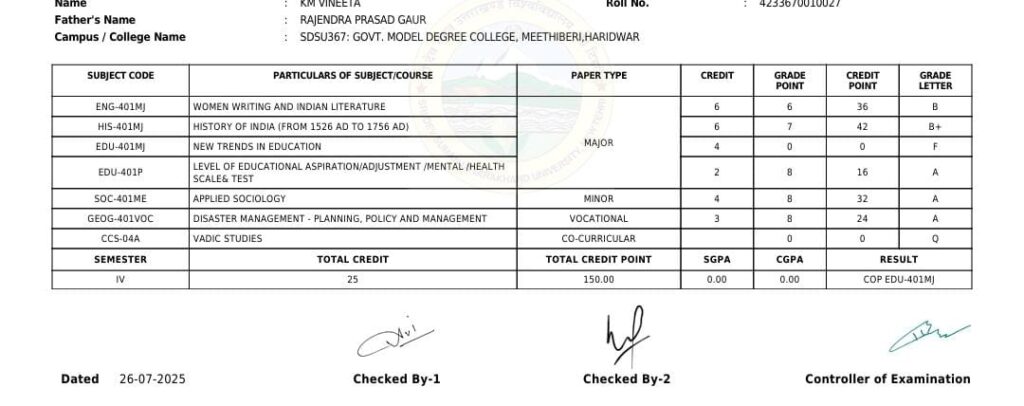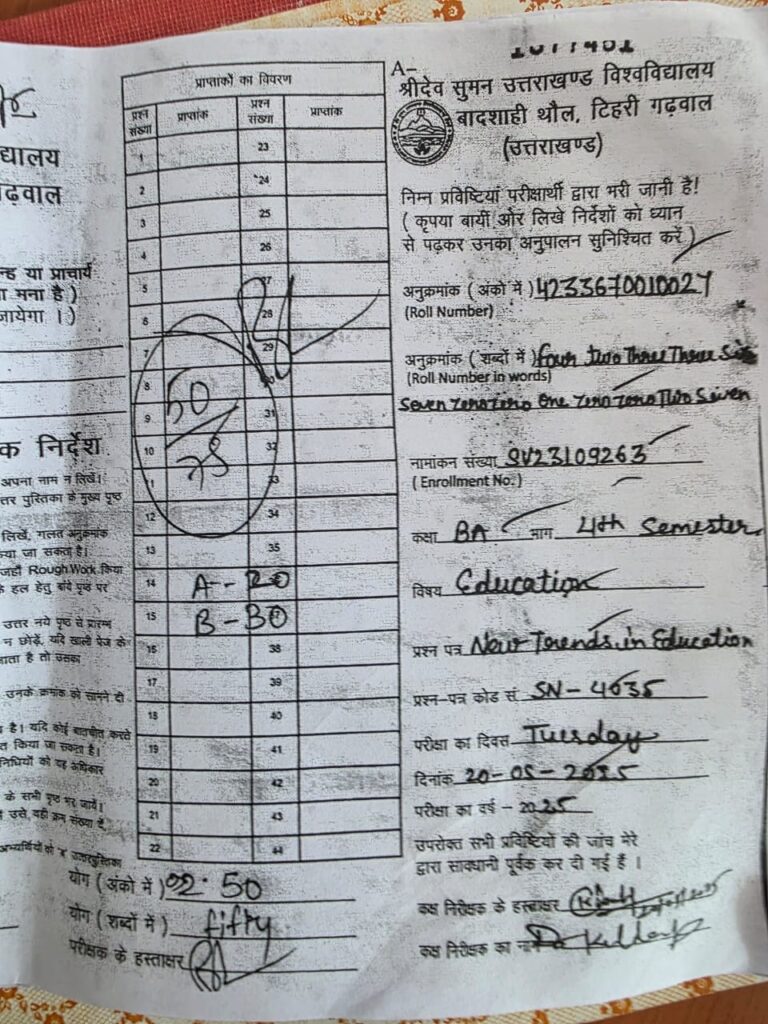 श्री देव सुमन उत्तराखंड विश्वविद्यालय बादशाइथोल के कारनामे एक के बाद एक उजागर हो रहे हैं। हाल ही में राजकीय मॉडल महाविद्यालय मीठीवेरी हरिद्वार के बी.ए. 4th सैम के एक छात्र को मार्कशीट में फेल कर दिया। छात्र काफी होशियार था इसलिए उसने आरटीआई के माध्यम से जब अपनी कॉपी को निकलवाया तो शिक्षा शास्त्र में उसके 75 में से 50 नंबर आ करके 1st क्लास से पास हो गया। यदि छात्र आरटीआई ना डालता तो उसका बैक एग्जाम सुनिश्चित था।