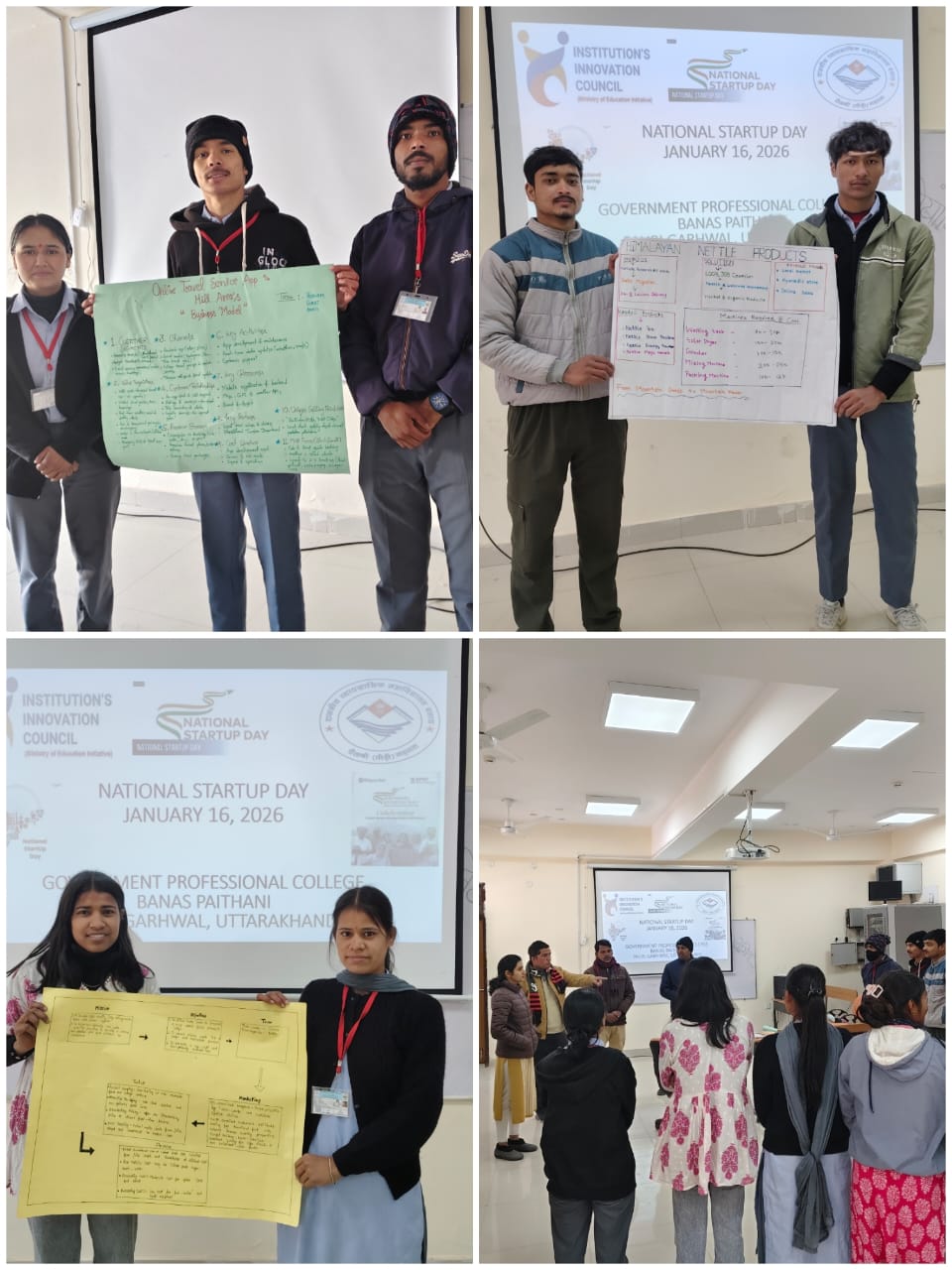 राष्ट्रीय स्टार्टअप दिवस के अवसर पर राजकीय व्यावसायिक महाविद्यालय, बनास पैठाणी द्वारा दिनांक 16 जनवरी 2026 को नवाचार एवं उद्यमिता की भावना को प्रोत्साहित करने हेतु “IDEA SHOWCASE – Poster Presentation of Ideas” कार्यक्रम का आयोजन किया गया। यह कार्यक्रम महाविद्यालय के इंस्टीट्यूट इनोवेशन काउंसिल (IIC) द्वारा आंतरिक गुणवत्ता आश्वासन प्रकोष्ठ (IQAC) के मार्गदर्शन में, करियर काउंसलिंग समिति तथा देवभूमि उद्यमिता योजना समिति के सहयोग से आयोजित किया गया।