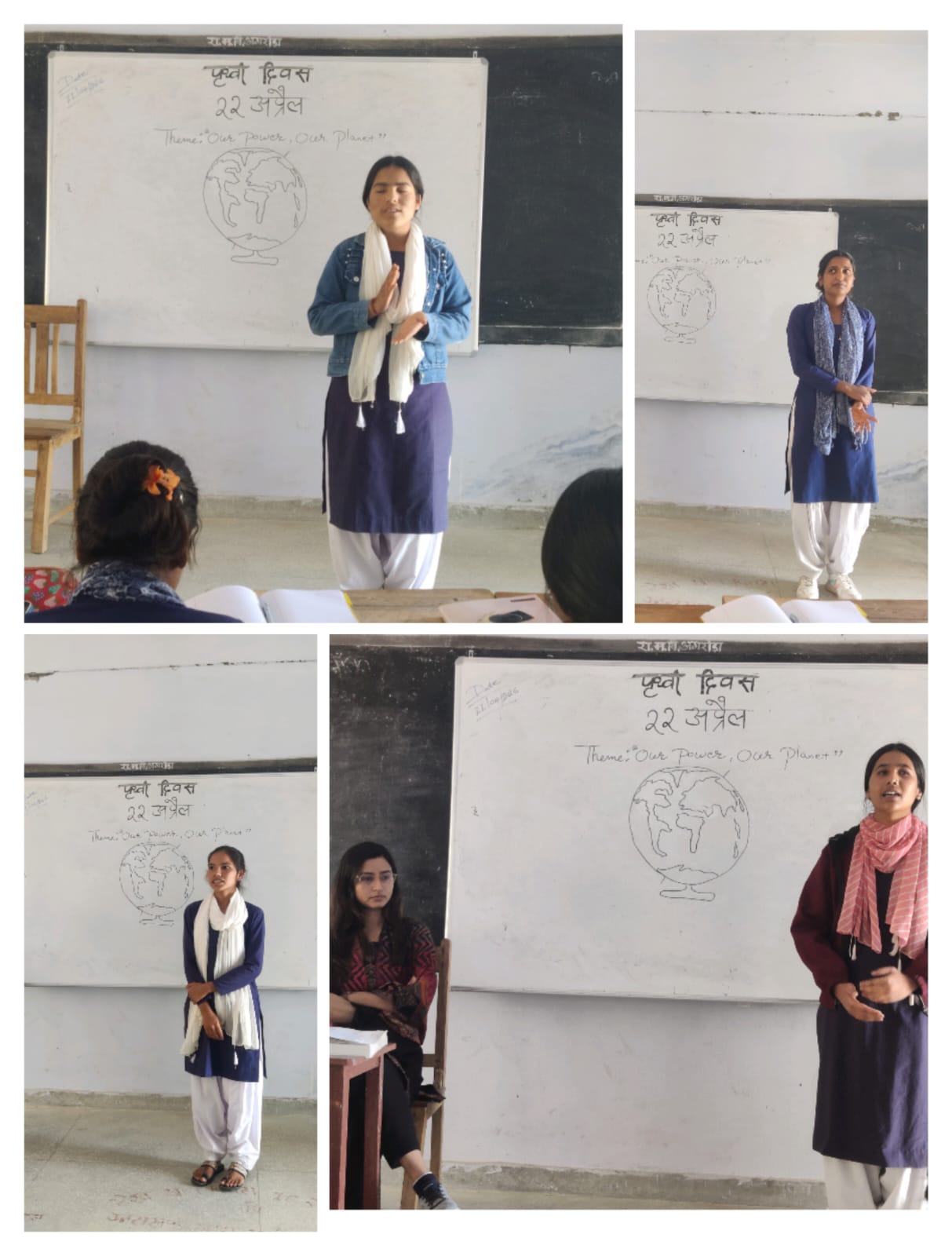 कोमल ने पृथ्वी दिवस की थीम पर विचार रखते हुए बताया कि हमारे पास एक हि ग्रह है जिसका संरक्षण हमें मिलकर करना चाहिए अनामिका एवं मानसी ने निष्कर्ष निकाला और बताया कि सन 1970 से ले कर अभी तक प्रतिवर्ष पृथ्वी दिवस को मनाए जाने के लिए भारत सहित विश्व स्तर पर 193 देशों द्वारा अपने अपने क्षेत्र में पर्यावरण संरक्षण जलवायु परिवर्तन आदि पर किए गए कार्य की समीक्षा की जानी चाहिए और पृथ्वी के संरक्षण हेतु विभिन्न पर्यावरणीय समस्याओं के निपटान हेतु आगे के लिए योजनाएं बनाई जानी चाहिए।