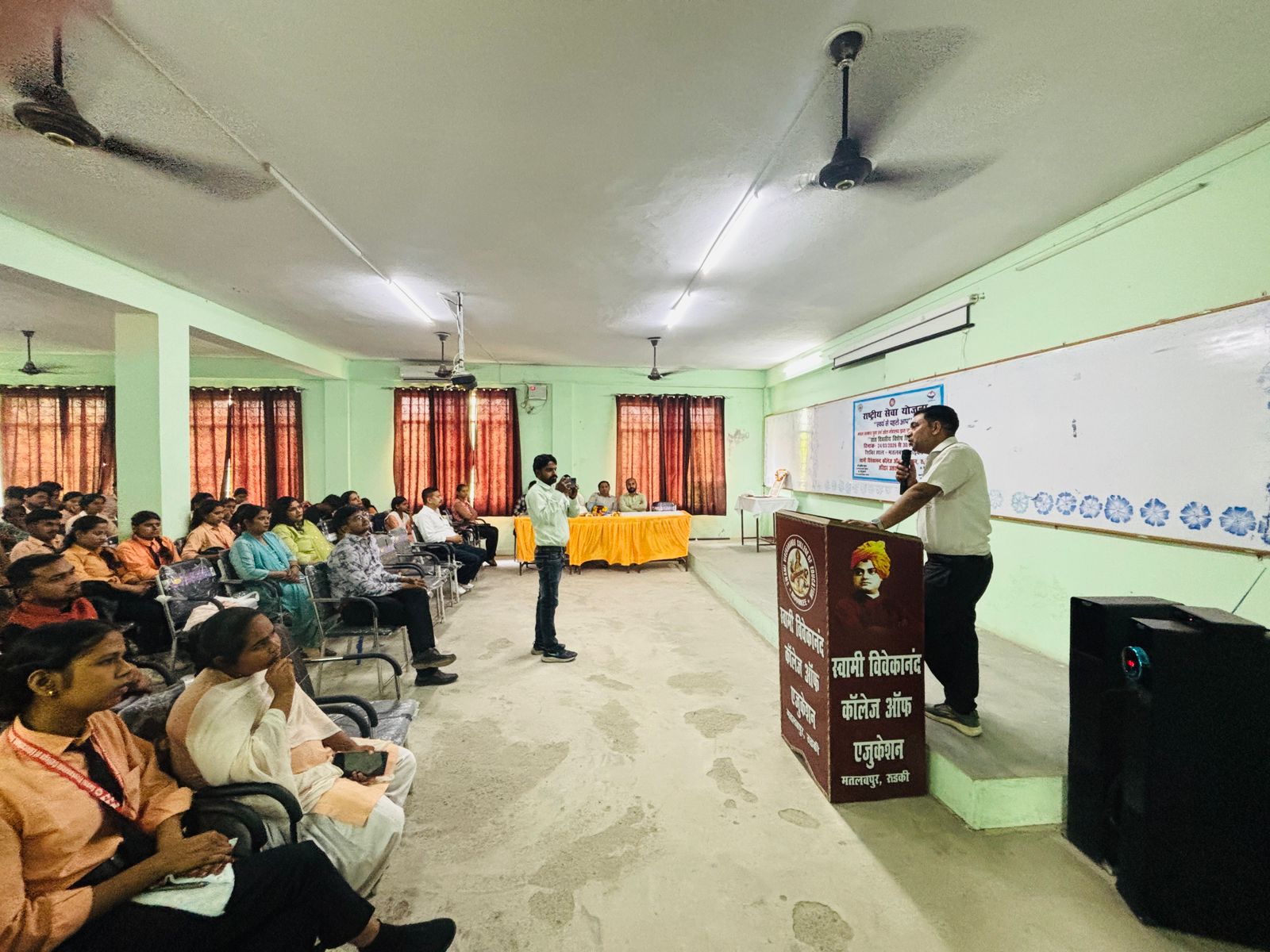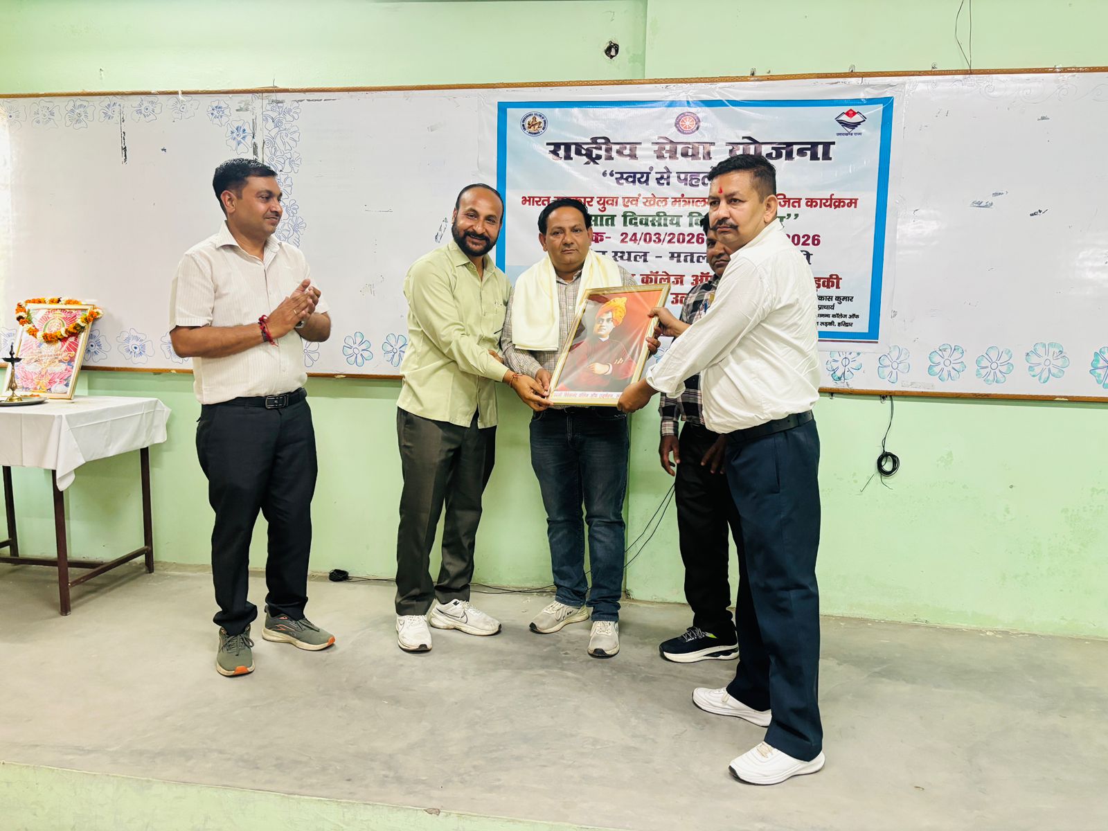 विशिष्ट अतिथि – डॉ. संदीप चौधरी ने अपने विचारों में अनुशासन, संस्कार एवं सेवा भावना के महत्व पर प्रकाश डालते हुए विद्यार्थियों को इन मूल्यों को अपने जीवन में अपनाने के लिए प्रेरित किया। सह-कार्यक्रम अधिकारी डॉ. रेनु ने भी अपने संबोधन में NSS के महत्व को बताते हुए छात्रों को समाज सेवा के लिए प्रेरित किया। प्राचार्य डॉ. विकास कुमार ने अपने संबोधन में कहा कि NSS छात्रों में सेवा, अनुशासन एवं सामाजिक उत्तरदायित्व की भावना विकसित करता है तथा विद्यार्थियों को इसे अपने जीवन में अपनाने के लिए प्रेरित किया।