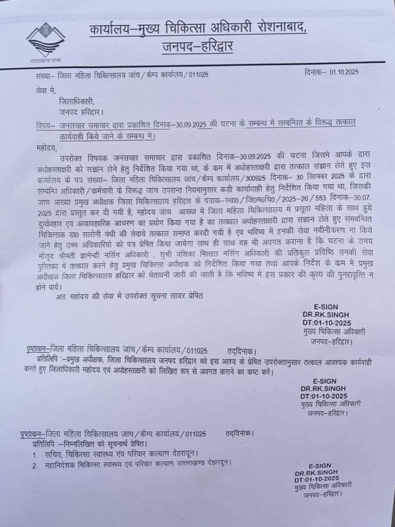 हरिद्वार:महिला चिकित्सालय में ड्यूटी पर तैनात डॉक्टर की सेवा की गई समाप्त, गर्भवती महिला से अमानवीय व्यवहार का मामला