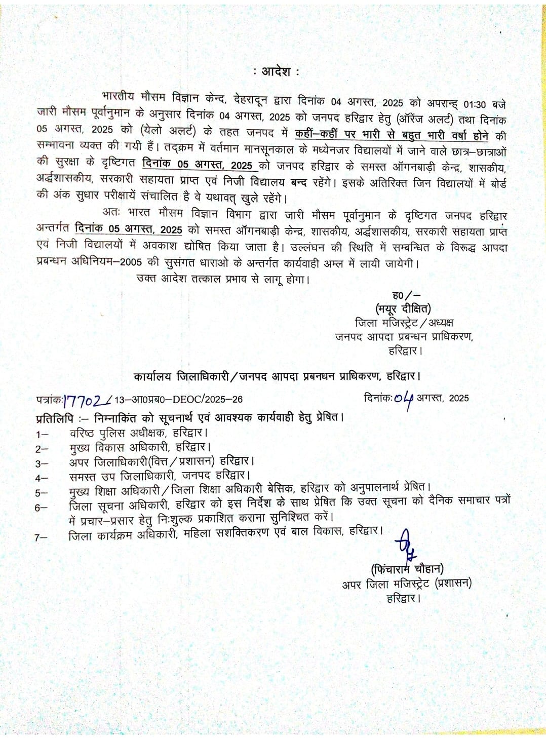 अतः भारत मौसम विज्ञान विभाग द्वारा जारी मौसम पूर्वानुमान के दृष्टिगत जनपद हरिद्वार अन्तर्गत दिनांक 05 अगस्त, 2025 को समस्त ऑगनबाड़ी केन्द्र, शासकीय, अर्द्धशासकीय, सरकारी सहायता प्राप्त एवं निजी विद्यालयों में अवकाश घोषित किया जाता है। उल्लंघन की स्थिति में सम्बन्धित के विरूद्ध आपदा प्रबन्धन अधिनियम-2005 की सुसंगत धाराओ के अन्तर्गत कार्यवाही अम्ल में लायी जायेगी।